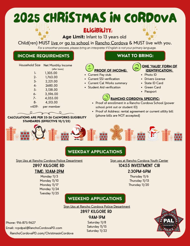 Rancho Cordova’s 15th Annual Christmas in Cordova celebration returns this December, spreading warmth, joy, and the magic of the season to families across our community. Hosted by RCPD’s PAL program, the event is built on a heartfelt belief: every child deserves to have a present to open on Christmas morning. Families will enjoy a cheerful drive-through experience where RCPD officers provide brand-new toys for children, helping make Christmas morning extra special.